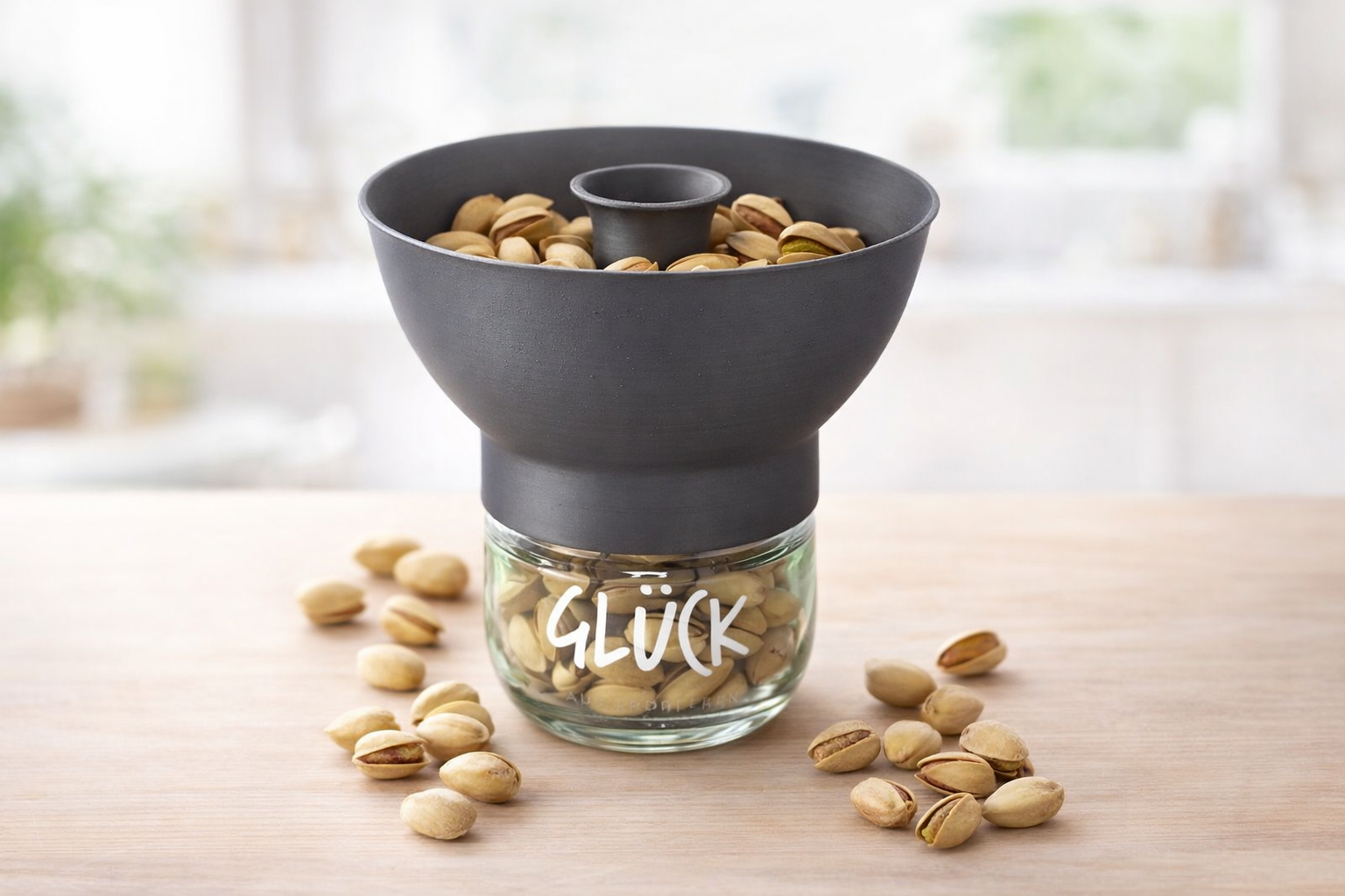 Mit dieser pfiffigen Schale, hat das Gekrümel auf der Couch ein Ende. Die Schale wird auf ein Glück-, oder ein Bonne Maman-Glas geschraubt, Pistazien, Erdnüsse oder andere kleine Hülsenfrüchte/ Süßigkeiten in Umverpackung  in die obere Schale gefüllt und dann wird losgesnackt. Die leeren Pistazien-/Erdnusschalen/Süßigktenverpackung einfach durch die Öffnung in der Mitte der Schale werfen und die Überbleibsel fallen in das Glas darunter und sind aufgeräumt.